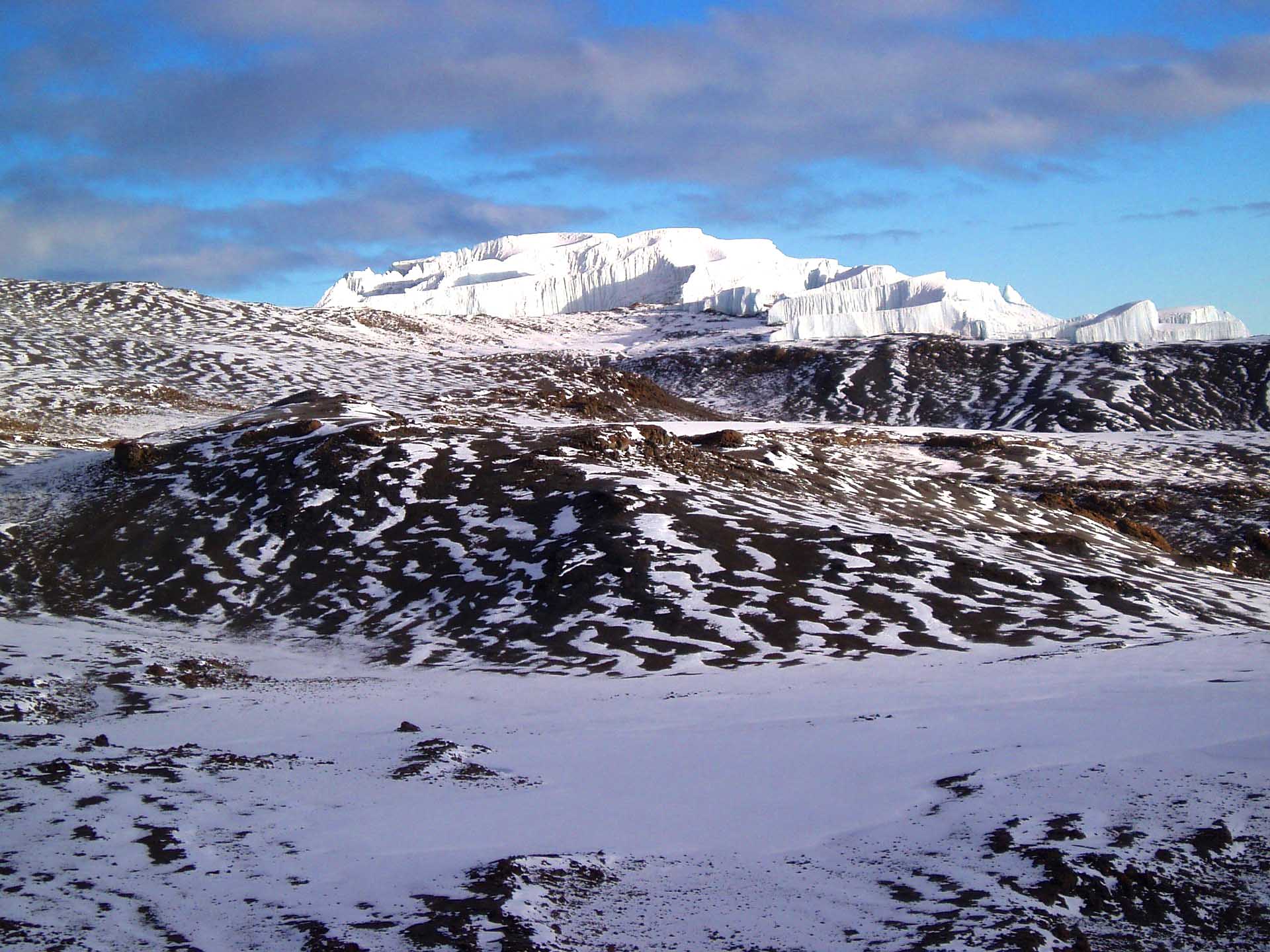 Wake to breakfast as usual, but if you wake early you can get some great photos of the sunrise. The first part of the days hike climbs through the dwindling heath land that blends into a moonscape as you enter the sweeping saddle connecting Mawenzi and Kibo. When you stop for lunch, and later when you cross this surprisingly large saddle, you can examine the summit climb up Kibo that you will be starting in just a few hours. Be careful to notice any signs of altitude sickness. There is no running water at the Kibo Huts.